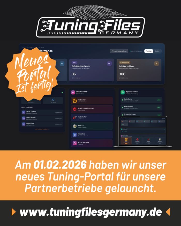 Am 01.02.2026 haben wir unser neues Tuning-Portal für unsere Partnerbetriebe gelauncht. Der Fokus liegt auf mehr Übersicht, moderner Optik und maximaler Benutzerfreundlichkeit – optimal für den Werkstattalltag.